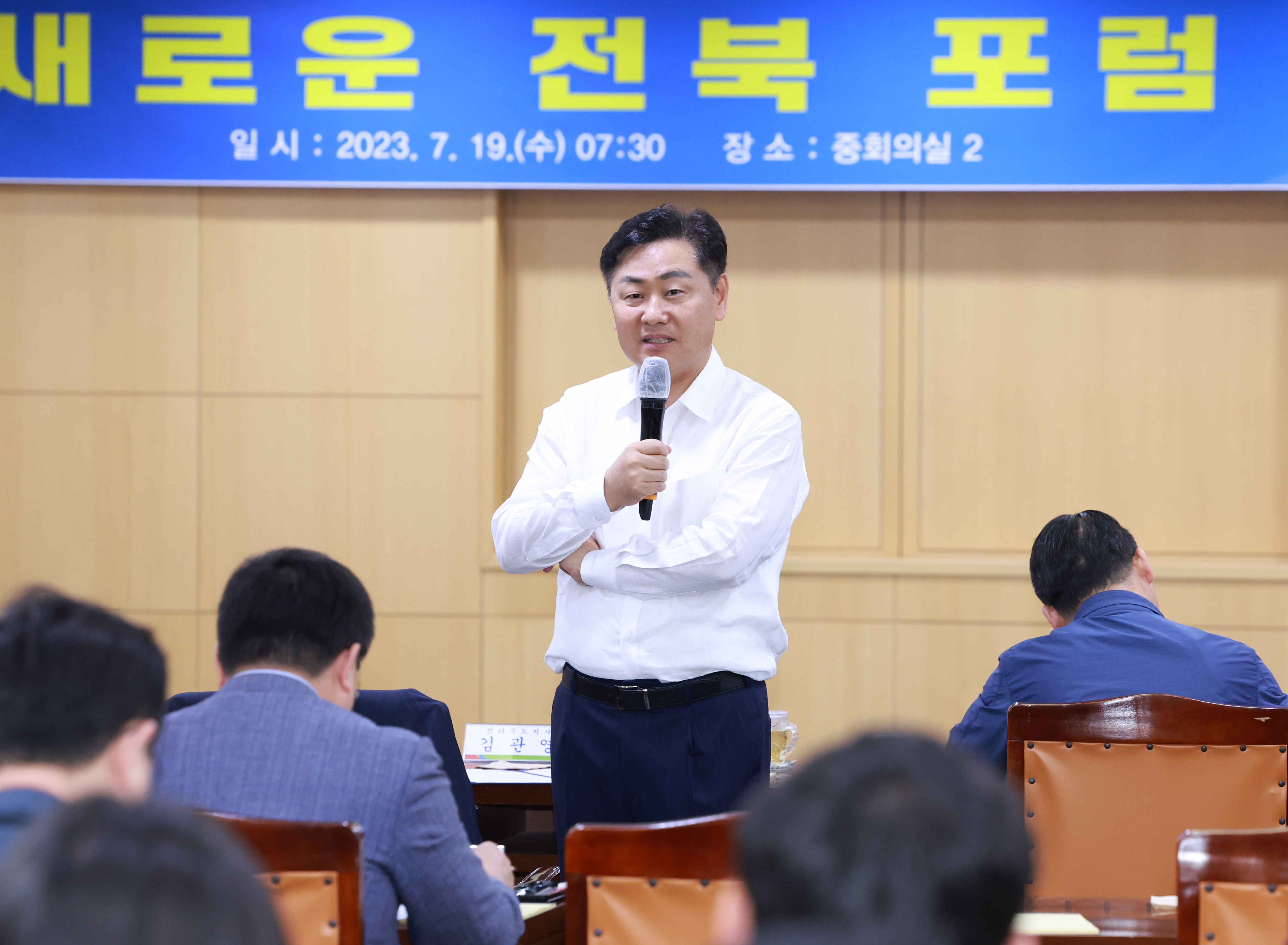 전북도는 19일 오전 7시 30분 도청 중회의실에서 김관영 도지사가 부지사, 실·국장 등 간부 공무원과 관련 출연기관장 및 직원 70여 명과 함께 ‘7월 새로운 전북 포럼’을 열고, ‘데이터 기반 바이오 소재 산업화’를 주제로 공부와 열띤 토론을 펼치는 시간을 가졌다고 밝혔다.