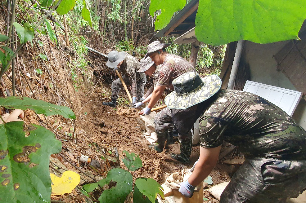 오는 22일 주말부터 다시 집중호우가 예고되면서 7733부대 3대대 장병들과 공무원들은 유등면 2곳의 주택 주변 경사면 유실지역의 토사제거 및 마대 쌓기에 나서 피해를 입은 주민들에게 큰 힘이 되었다.