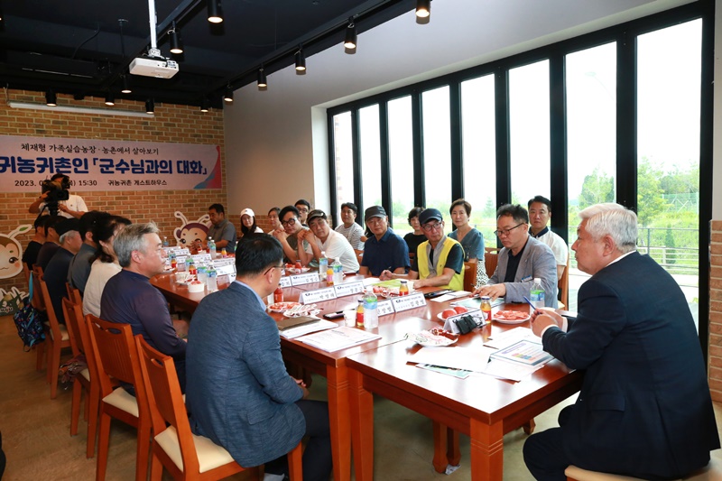 이날 만남은 예비 귀농 · 귀촌인의 안정적 정착을 돕기 위한 지원정책 방향을 고민하고 지역민과의 상생발전 방안을 모색하기 위해 마련된 것으로, 무주군 안성면에 소재해 있는 ‘체재형 가족실습농장’ 입교생과 ‘농촌에서 살아보기’ 에 체험 중인 예비 귀농 · 귀촌인 18명이 자리를 함께 했다.
