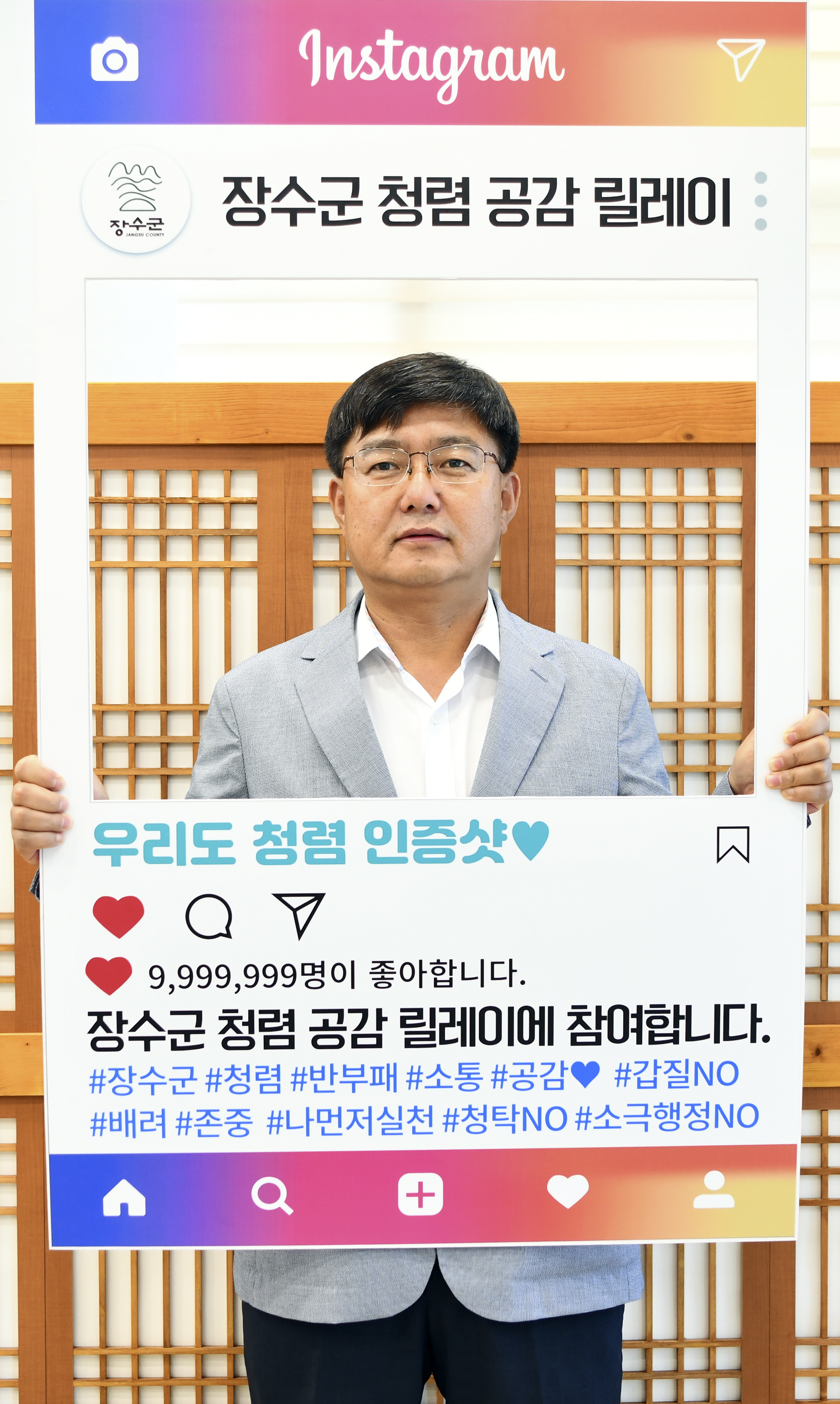 ‘청렴 공감 릴레이 캠페인’은 장수군의 고위공무원이 자신만의 청렴 문구와 SNS 형식의 포토 프레임을 활용해 촬영한 인증사진을 내부 게시판에 공유하며 청렴 의지를 전파하는 방식으로 진행한다.