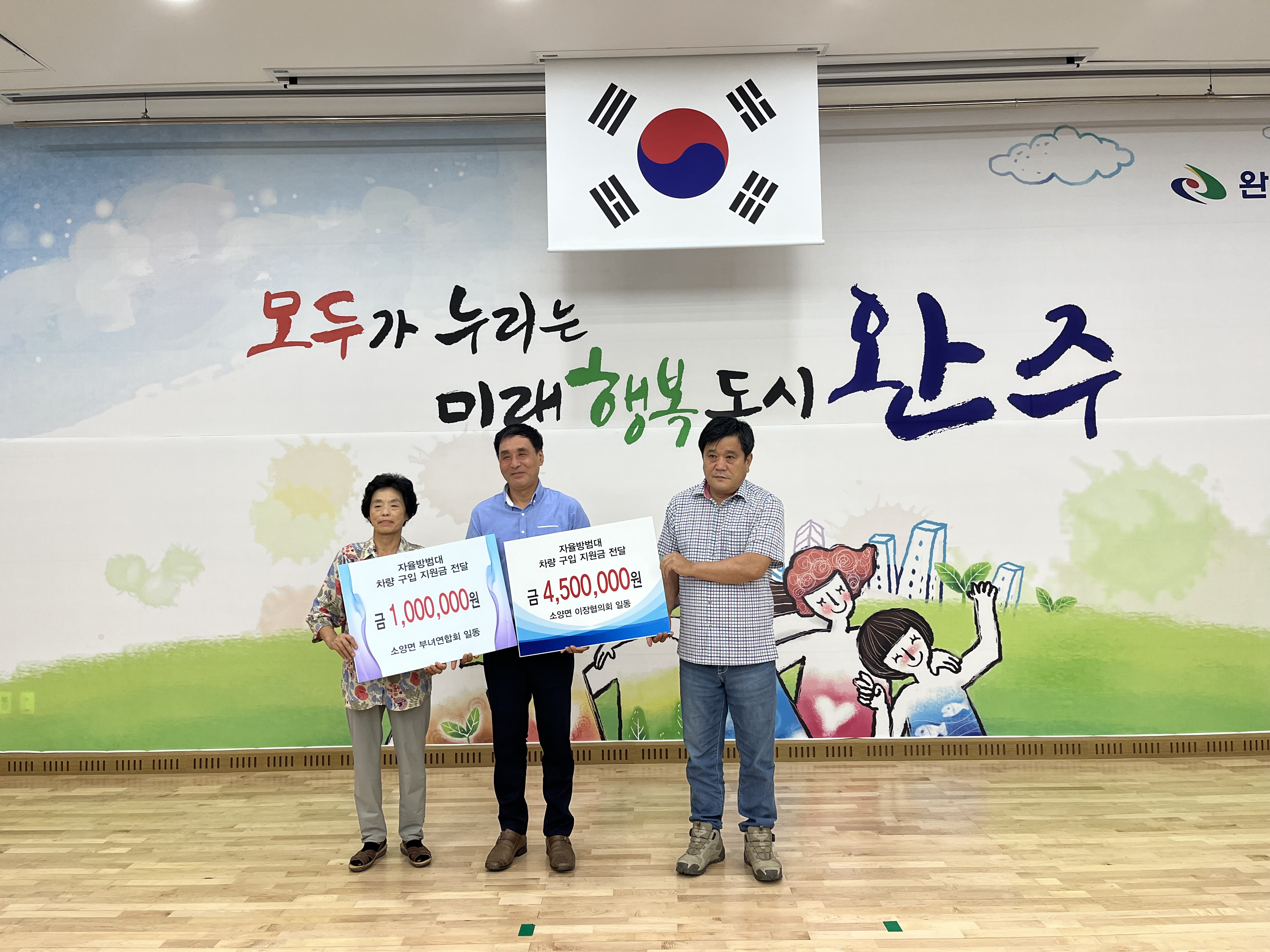 [완주=뉴전북] 완주군 소앙면 이장협의회(회장 박성래), 새마을부녀연합회(회장 이순남)가 자율방범대(대장 송효종) 차량 지원금 550만 원을 전달했다.