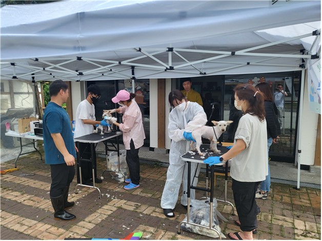 [임실=뉴전북] 전북 임실군이 지난 25일 오수지구 도시재생현장센터와 오수면 장터에서 유기견의 위생 및 건강 관리와 주민들의 인식개선을 위한 반려동물 친화 도시 만들기 프로젝트로 유기견 미용과 목욕 봉사활동을 진행했다.