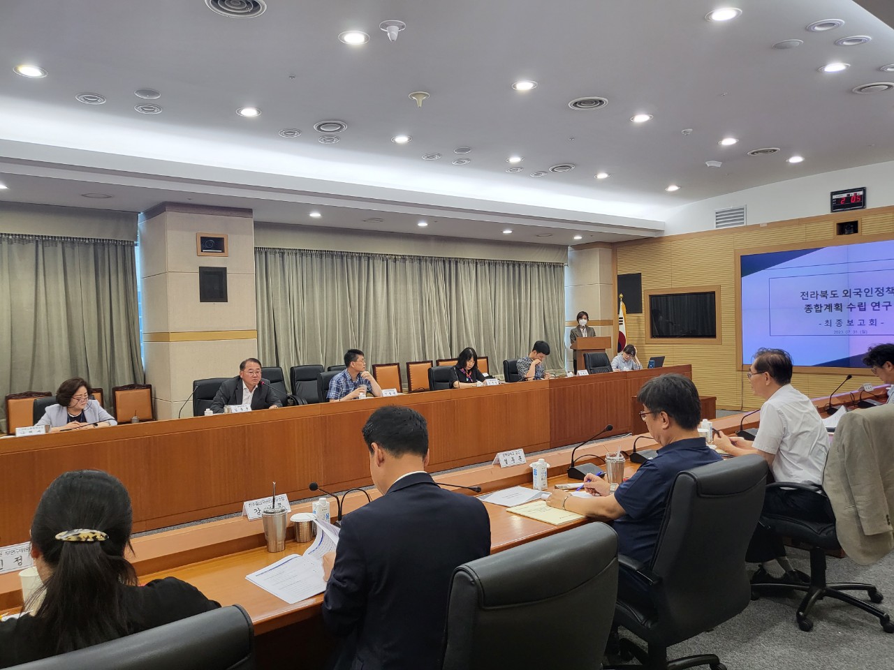 [도정=뉴전북] 전북도는 7월 31일 인구정책 패러다임이 외국인주민 유입 및 정착지원으로 변화되고 있는 것에 대응하고, 도차원의 외국인 정책 로드맵 수립을 위해 김종훈 경제부지사 주재로 전문가, 연구진, 분야별 외국인 소관부서와 함께 『전라북도 외국인정책 종합계획 용역』최종보고회를 가졌다.