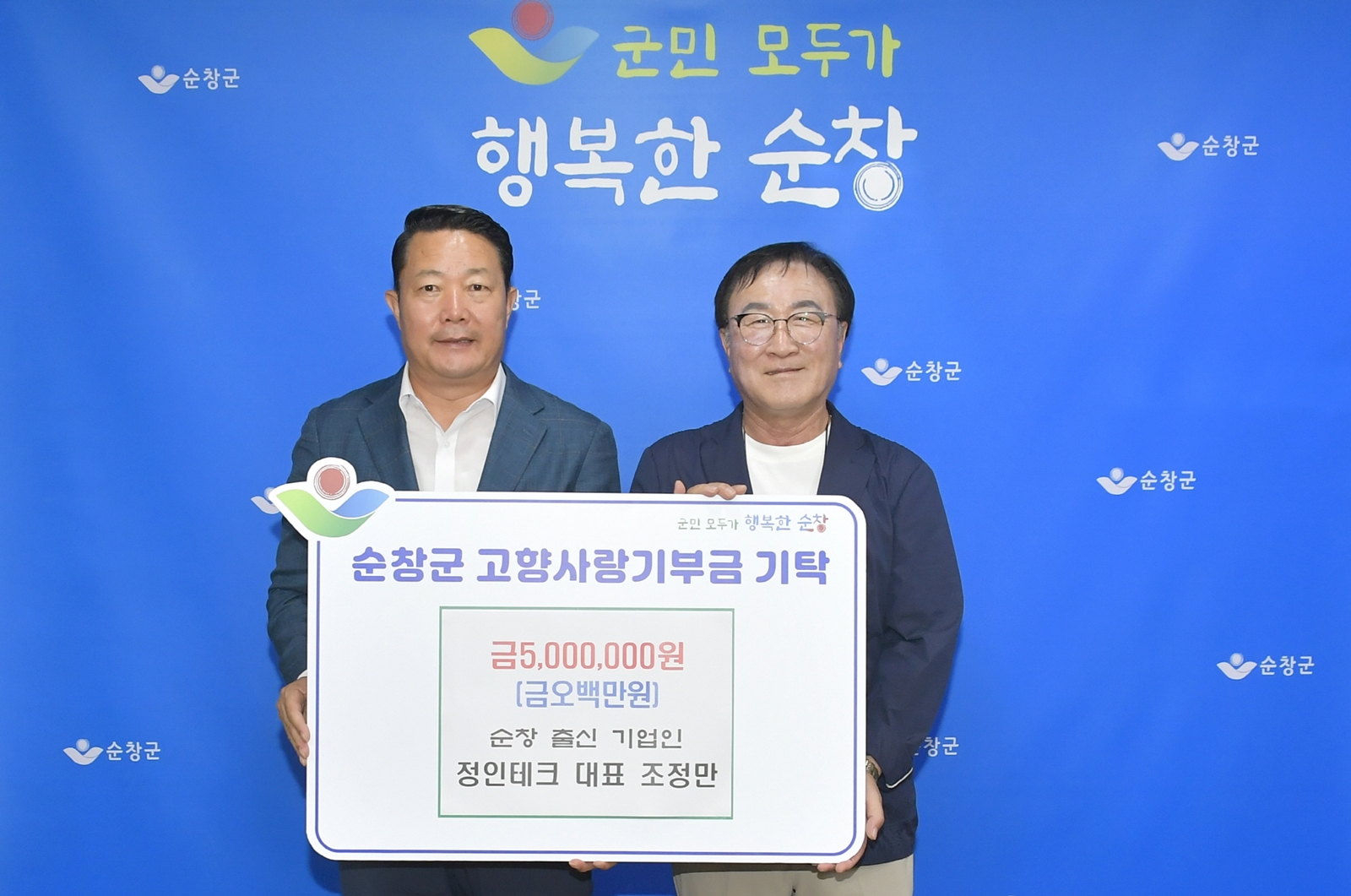 순창군은 1일 순창읍 출신으로 정읍에서 전지용 동박 제조 기업을 운영 중인 정인테크 조정만 대표가 고향사랑기부금 연간 한도액인 500만 원을 기부했다고 밝혔다.