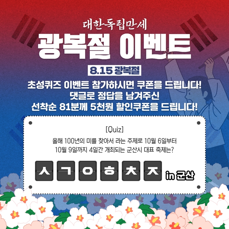 [군산=뉴전북] 군산시는 4일 공공 배달앱 ‘배달의 명수’가 ‘빛을 되찾은 날, 광복절’을 기념해 순국선열에게 감사한 마음을 담아 광복절 8.15 이벤트를 진행한다고 밝혔다.