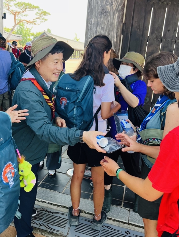 [김제=뉴전북] 7일 정성주 김제시장은 2023 새만금 세계잼버리 지역연계 프로그램 활동장을 방문해 체험 프로그램을 점검하고, 연일 계속된 폭염에 지친 스카우트 대원을 격려했다.