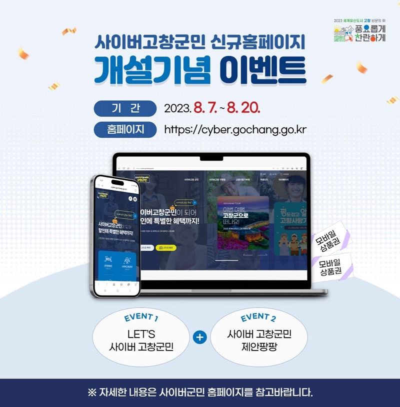 [고창=뉴전북] 전북 고창군이 ‘사이버 고창군민’ 신규 홈페이지 개설 기념으로 오는 20일까지 2주간 이벤트를 진행한다고 밝혔다.