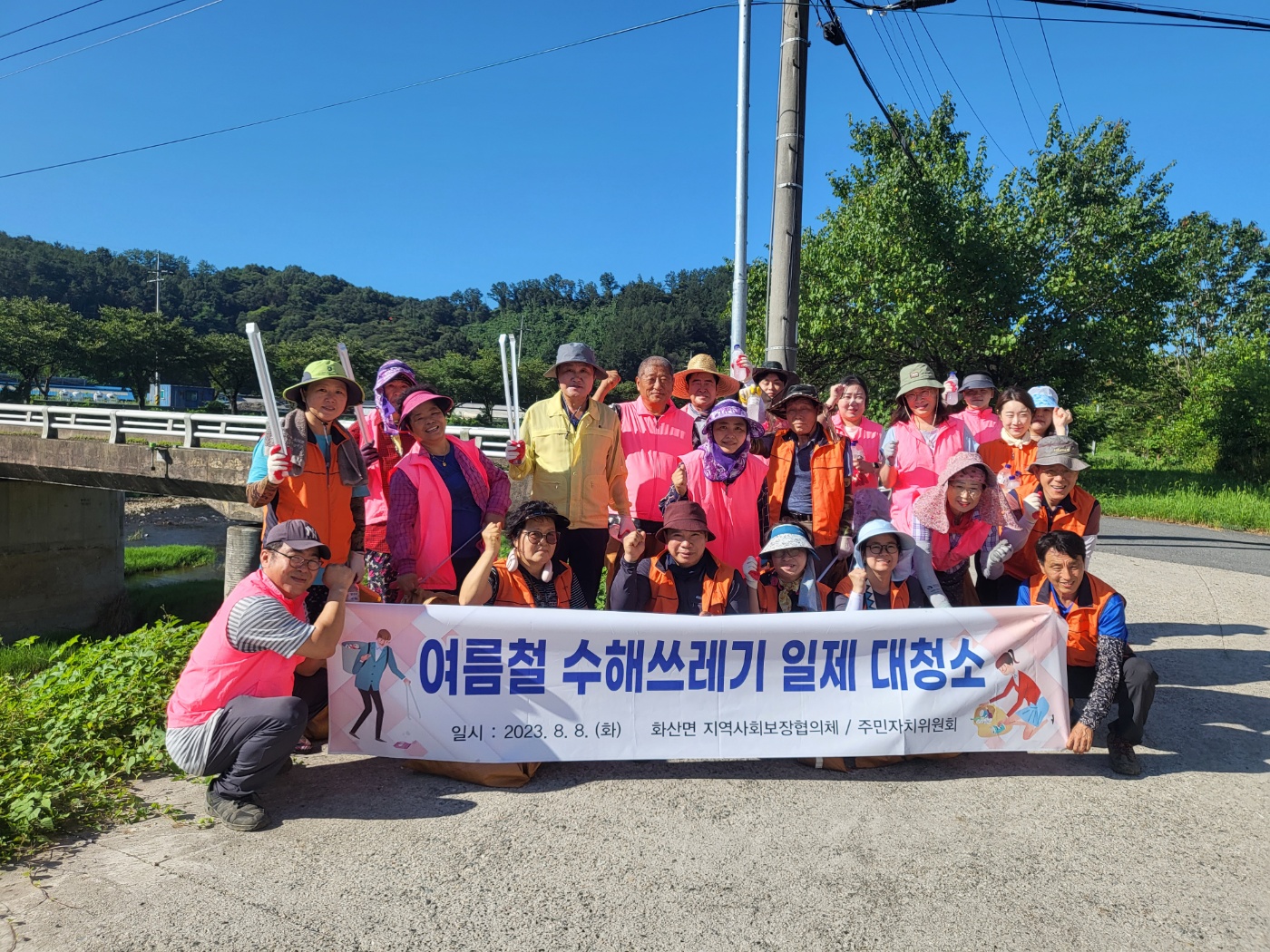 지난 8일 여름철 폭우로 하천변에서 발생된 쓰레기를 집중적으로 수거하기 위해 화산면 지역사회보장협의체와 주민자치위원회, 공무원 등 50여명이 현장을 찾아 구슬땀을 흘렸다.