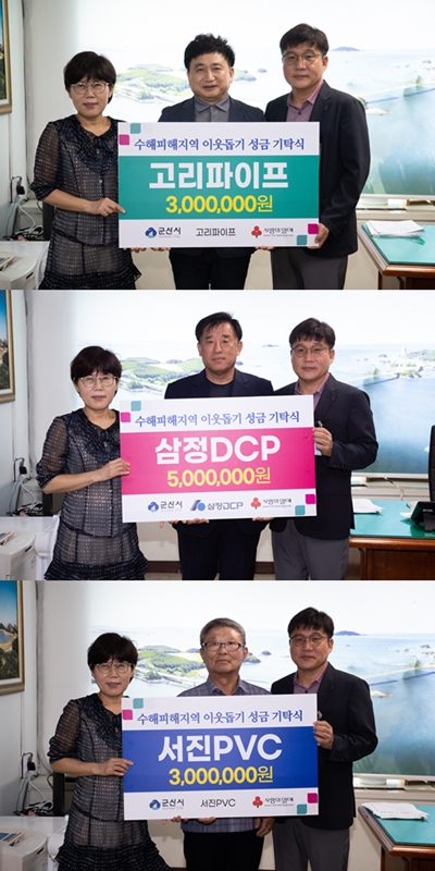 또, 개정동에 위치한 서진PVC(대표 이규진)는 건축자재 및 파이프를 생산하는 기업으로 이번 수해로 피해를 입은 주민들의 빠른 복구를 위해 성금 300만 원을 기탁했다.