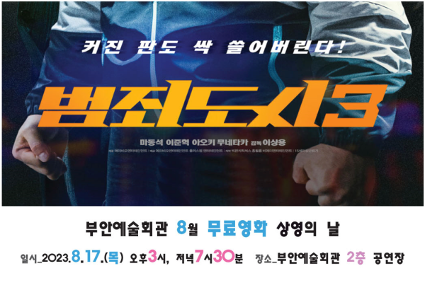 [부안=뉴전북] 부안군은 <범죄도시 3>을 오는 8월 17일(목) 오후 3시와 오후 7시 30분 하루 2회에 걸쳐 부안예술회관 공연장에서 무료로 상영한다.
