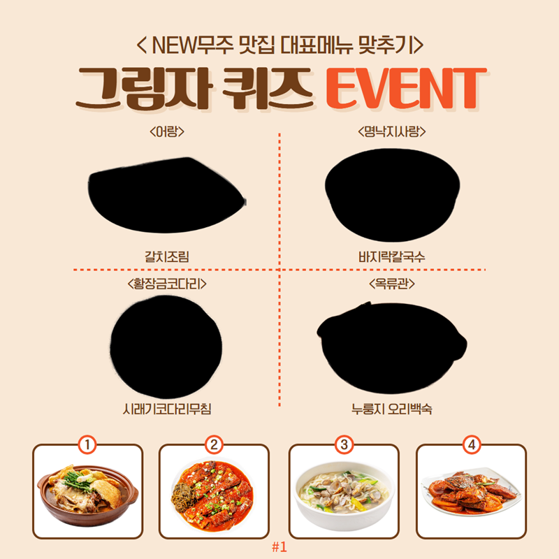 이번 이벤트는 올해 새롭게 선정한 10개의 업소를 홍보하고 방문객들에게 검증된 맛 집을 소개해 무주여행의 만족도를 높인다는 취지에서 진행하는 것으로 이벤트 참여는 인스타그램에서 “무주 더(The) 맛집”을 검색한 뒤 이벤트 게시글에 댓글로 그림자 퀴즈 ‘23년 새롭게 선정된 업체들 누구누구 있나?’의 정답(그림자로 가려진 무주맛집의 대표메뉴를 찾아 상호명과 대표메뉴를 알맞게 매칭해 3개 이상 댓글)을 올리면 된다.