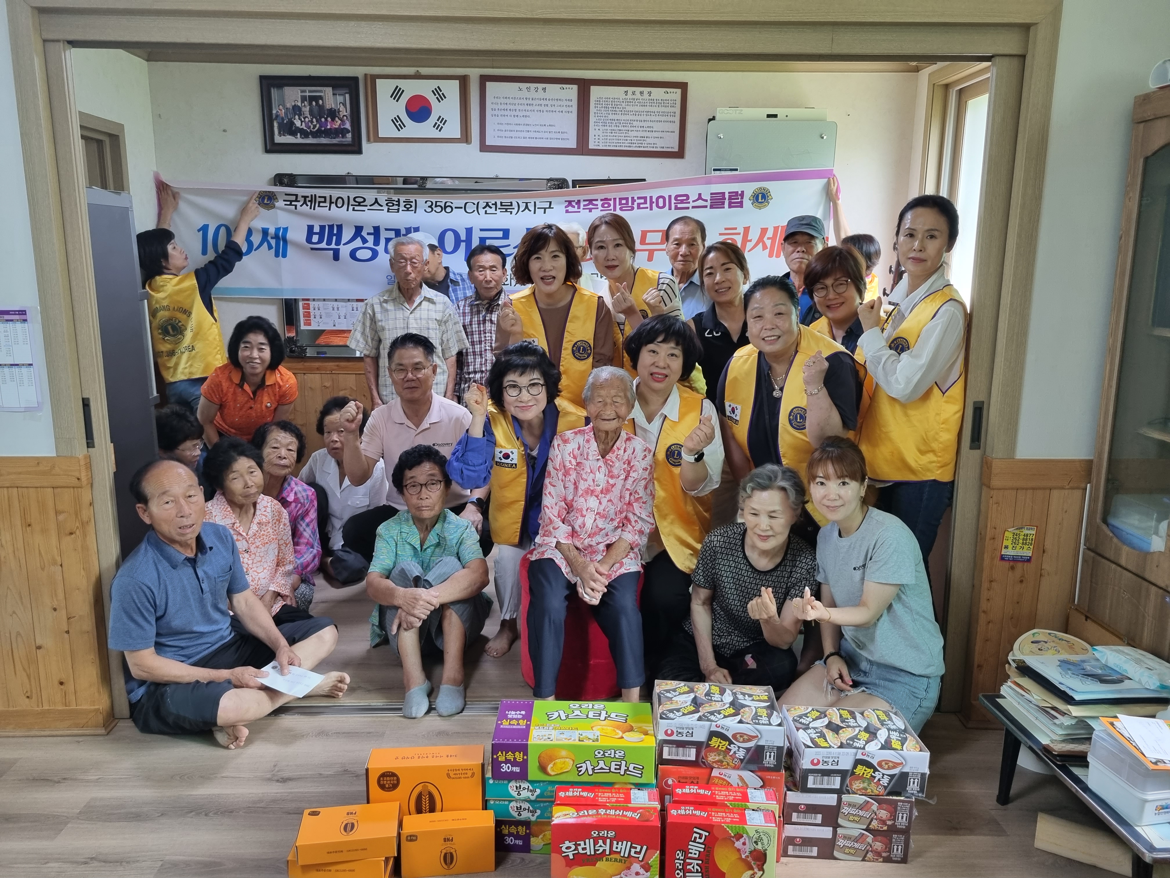 17일 동상면에 따르면 전주희망라이온스클럽은 관내 최고령자 중 한 명인 103세 백성례 어르신을 포함한 15명의 어르신이 모인 자리에서, 무더운 여름 입맛이 없는 어르신들을 위해 양갱 과자, 초코파이, 카스테라 빵, 즉석라면 등 다양한 간식물품을 제공하고, 마을 어르신들을 위한 금일봉을 전달했다.