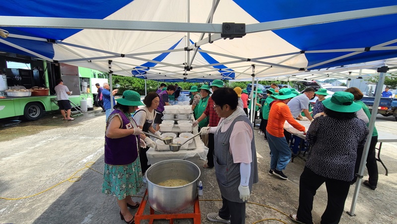이날 나눔 행사에는 정우면사무소 직원들과 정우면 새마을부녀회, (사)참좋은사람들 사랑나눔공동체 회원 등 50여 명이 한마음으로 참여해, 푸드뱅크 차량에서 직접 닭을 손질하고, 각종 약재로 우려낸 육수로 삼계탕 450인분을 조리했다.