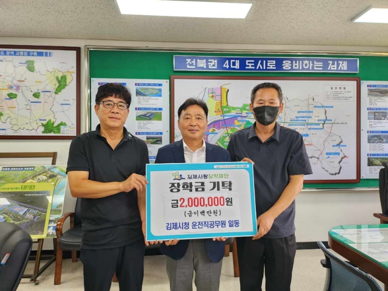 [김제=뉴전북] (재)김제사랑장학재단(이사장 정성주)은 22일 김제시청 운전직공무원 일동이 지역의 우수 인재 양성을 위해 써달라며 장학기금 2백만 원을 기탁했다고 밝혔다.