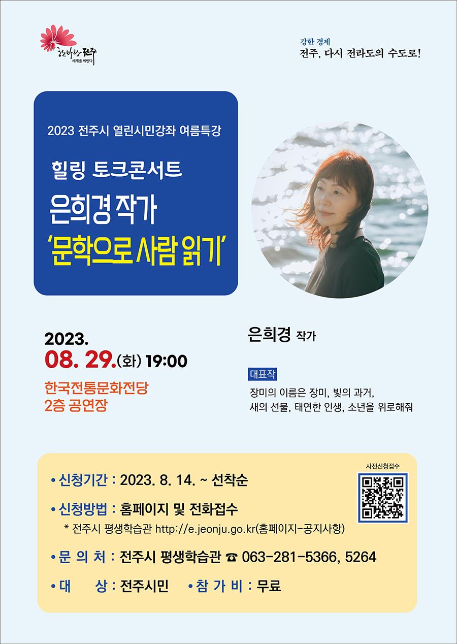 [전주=뉴전북] 전주시는 오는 29일 오후 7시, 한국전통문화전당에서 은희경 작가를 강사로 초청해 ‘2023 전주시 열린시민강좌 여름특강’을 개최한다.