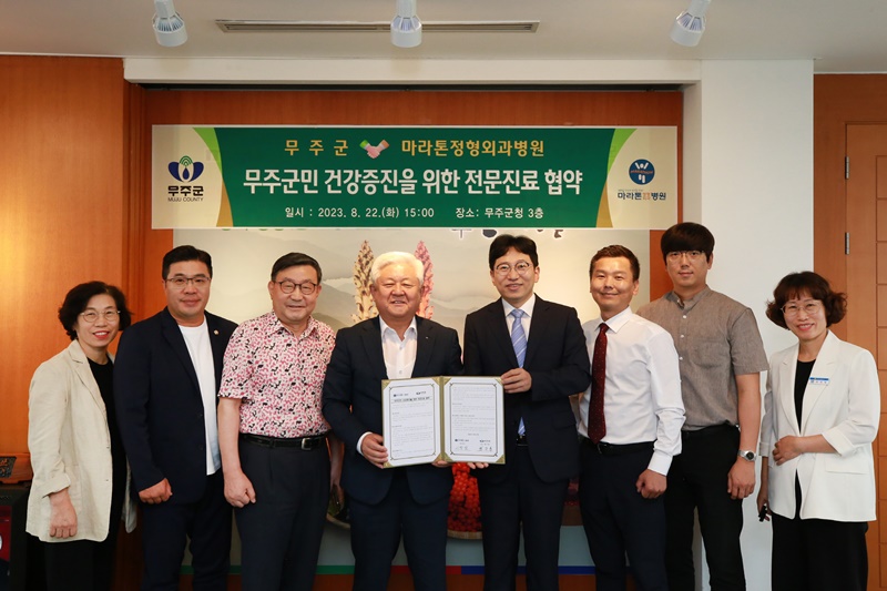 [무주=뉴전북] 무주군은 지난 22일 대전 둔산동에 소재한 마라톤정형외과병원(원장 이정범)과 ‘무주군민 건강증진’을 위한 전문 진료협약을 체결했다고 밝혔다.