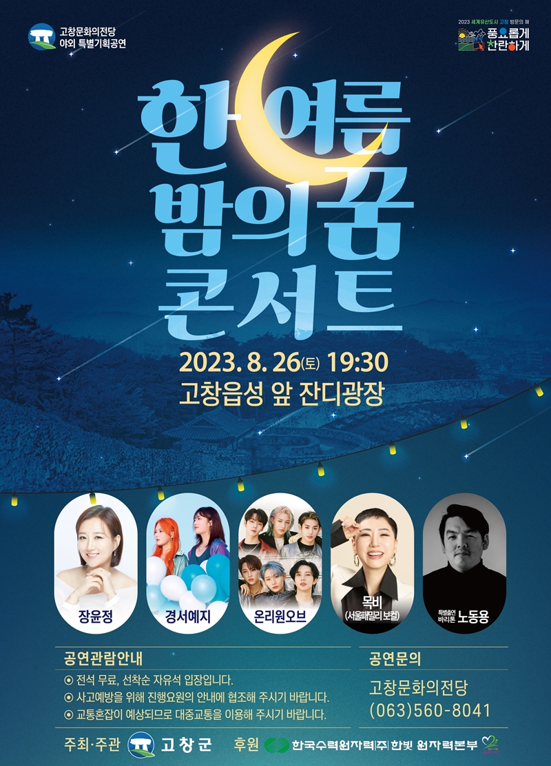 [고창=뉴전북] 고창군이 2023세계유산도시 고창 방문의해를 맞아 고창문화의전당 야외특별기획공연 ‘한여름밤의 꿈 콘서트’를 오는 26일 저녁 7시30분 고창읍성 앞 잔디광장에서 연다.