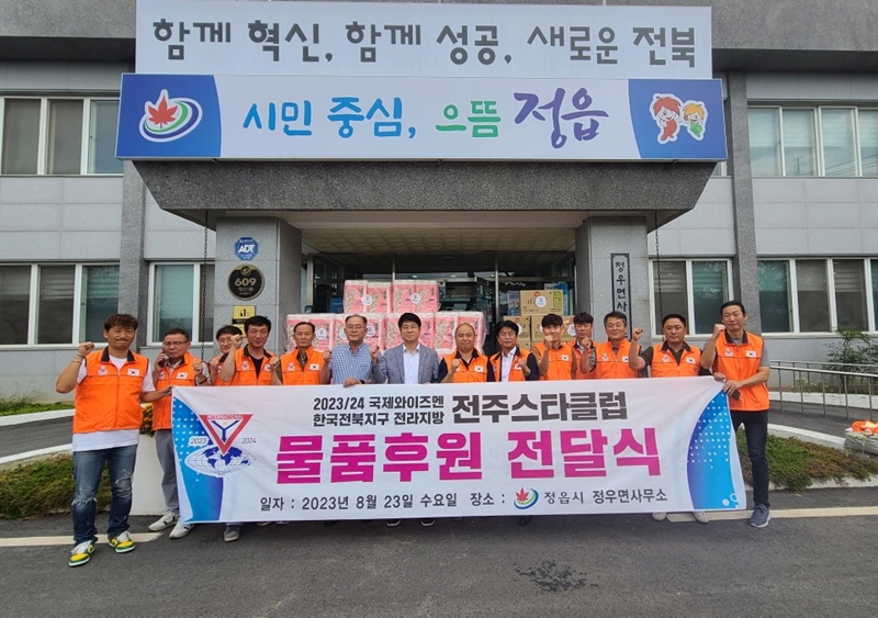 [정읍=뉴전북] 국제와이즈맨 전주스타클럽 회원 일동은 지난 23일 정읍시 정우면사무소를 방문해 이웃돕기 물품을 기탁했다.