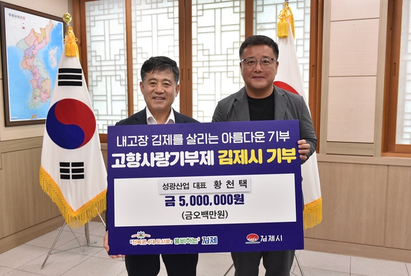 [김제=뉴전북] 성광산업 황천택 대표는 24일 김제시를 방문해 고향사랑기부로 최고액인 500만 원을 기탁했다.