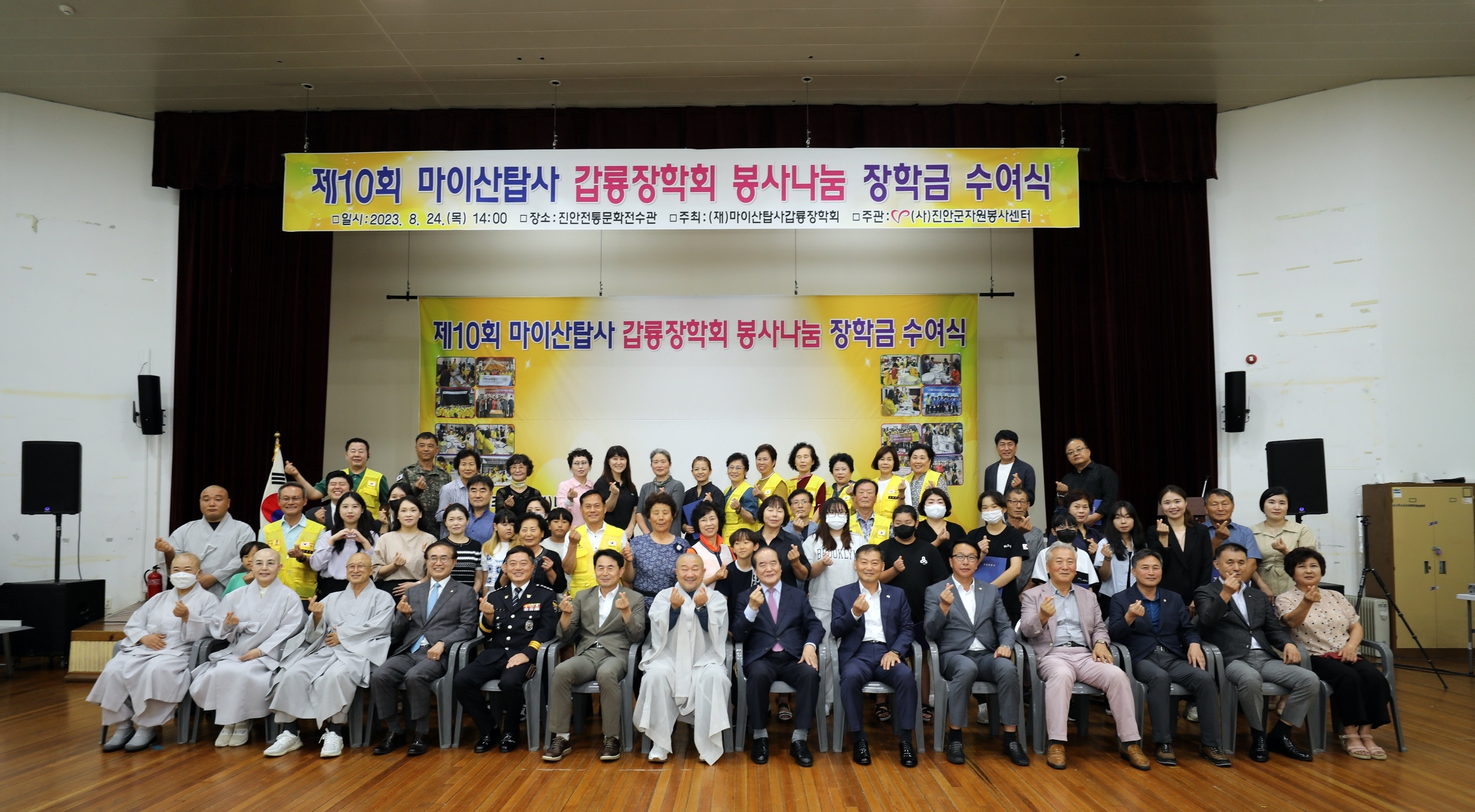 [진안=뉴전북](재) 마이산탑사 갑룡장학회(이사장 진성스님) 주최, (사)진안군자원봉사센터(이사장 진성스님(이재동)) 주관으로 지난 24일 진안전통문화전수관에서 40명의 장학생에게 장학금 일천사백사십만원을 전달했다.