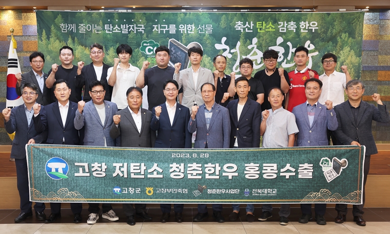 [고창=뉴전북] 고창군이 28일 지역 청춘한우 농가에서 생산된 ‘고창 저탄소 청춘한우’를 홍콩으로 첫 수출하는 기념식을 열었다.