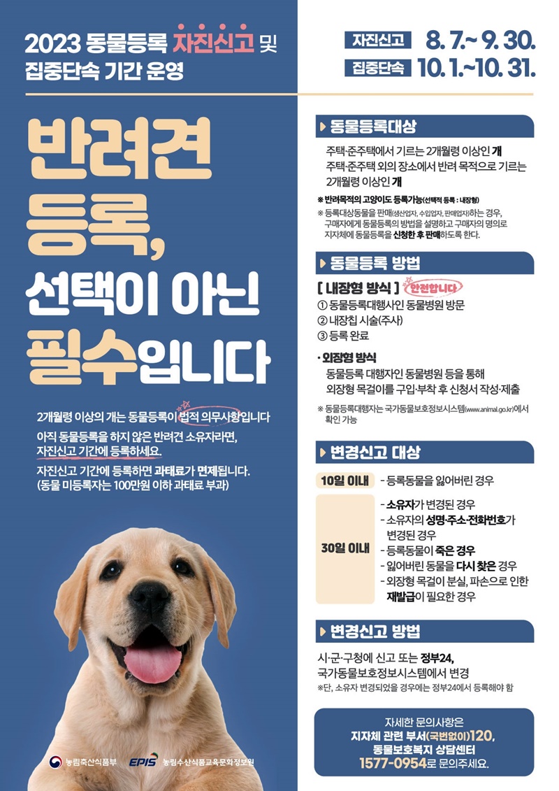 현행 동물보호법상 반려동물을 등록하지 않거나, 소유자 및 동물의 변경사항이 발생했음에도 30일 이내에 변경 신고를 하지 않을 경우 최대 100만 원 이하의 과태료가 부과되나, 9월 30일까지 자진신고를 하면 과태료가 면제된다. 등록·변경은 동물등록 대행 동물 병원에서 가능하다.