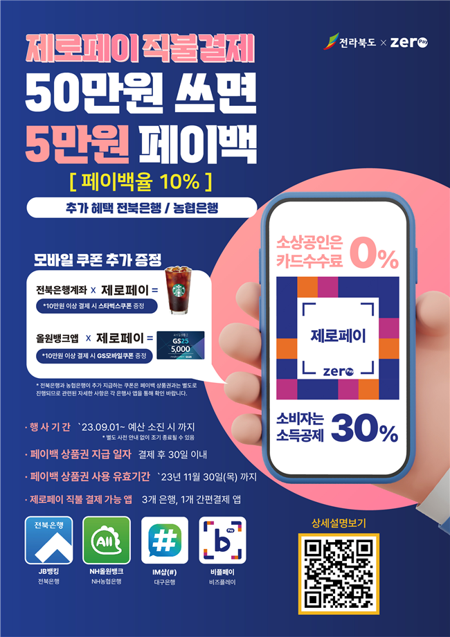 [도정=뉴전북] 전북도가 수수료 없는 결제서비스인 제로페이 이용 활성화를 위해 9월 1일부터 ‘제로페이 직불결제 페이백 행사’를 진행한다.