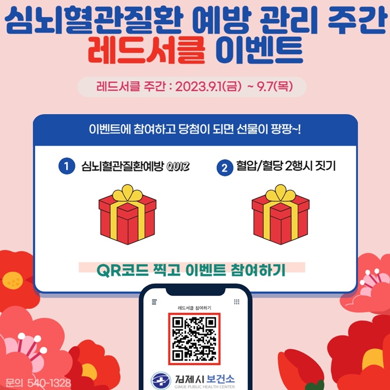 또한 9월 1일 금요일부터 9월 7일 목요일까지 운영하는 심뇌혈관질환예방 퀴즈, 혈압/혈당 2행시 이벤트는 아래 QR코드를 각자 소지한 핸드폰으로 스캔하면 참여 가능하며 추첨 및 심사를 통해 소정의 상품을 지급할 예정이다.