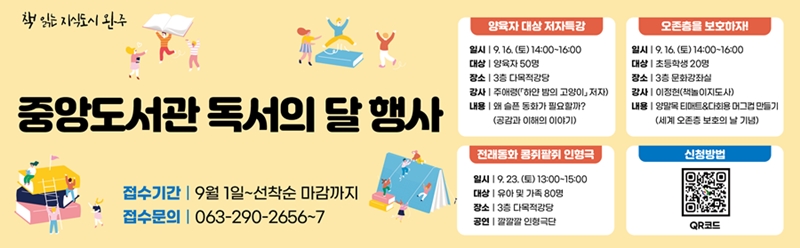 중앙도서관은 독서의 달을 맞아 ▲양육자 대상으로 ‘하얀 밤의 고양이’의 주애령 저자 초청 강연 ‘왜 슬픈 동화가 필요할까?’ (공감과 이해의 이야기) ▲환경 보호 책놀이 프로그램 ‘오존층을 보호하자!’ ▲어린이 인형극 ‘콩쥐팥쥐’ ▲과월호 나눔 행사 등 7개 프로그램을 운영한다.