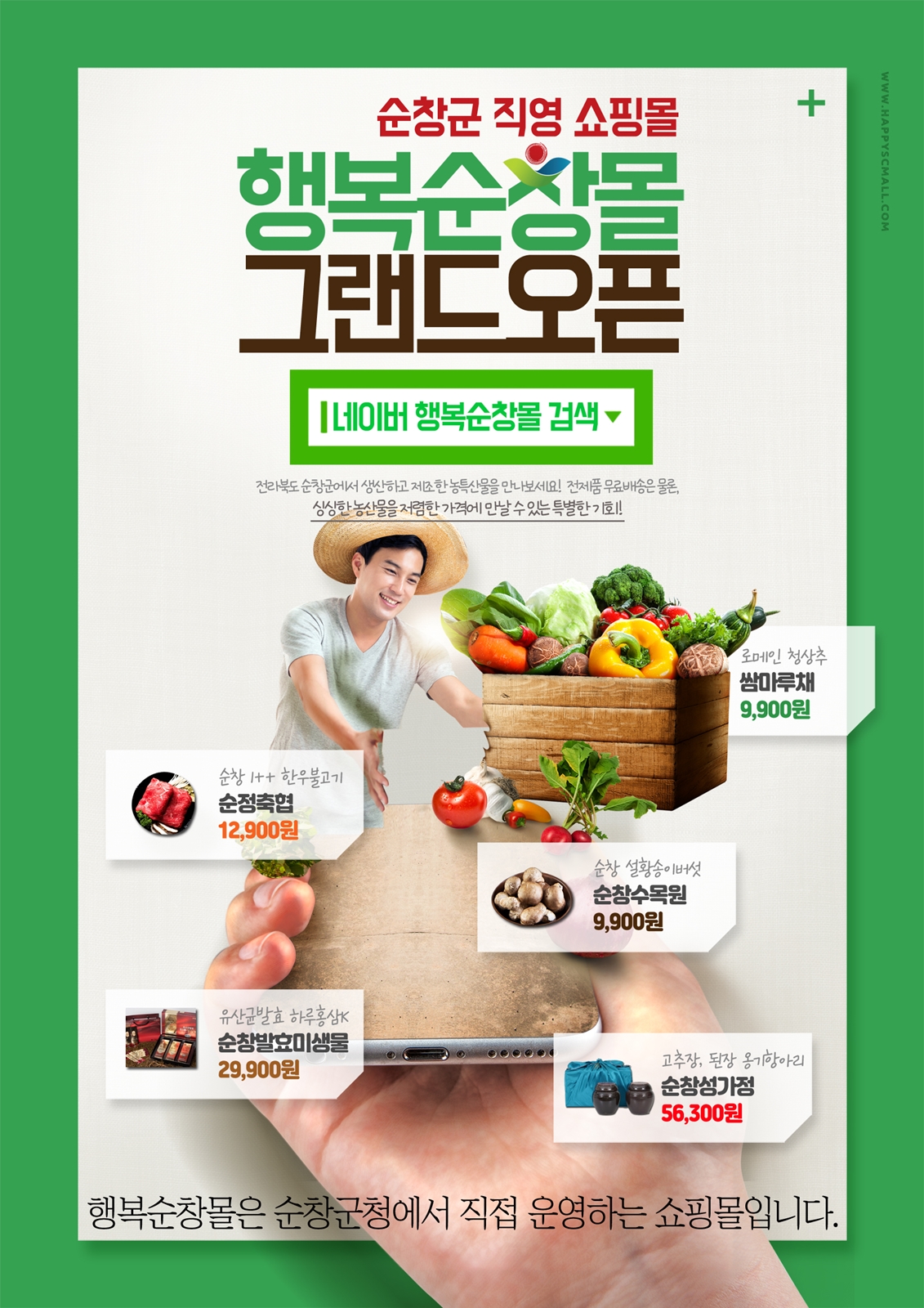 ‘행복순창몰’은 순창군이 지난 7월 순창의 농특산물 홍보와 온라인 판매를 위해 직접 개설한 인터넷 쇼핑몰이다. 군 직영을 통해 농가는 생산에 집중하고, 행정에서는 쇼핑몰 운영 및 관리를 지원해 소비자들에게 유통 마진을 제외한 합리적인 가격으로 농특산물을 제공하기 위해 개설됐다.