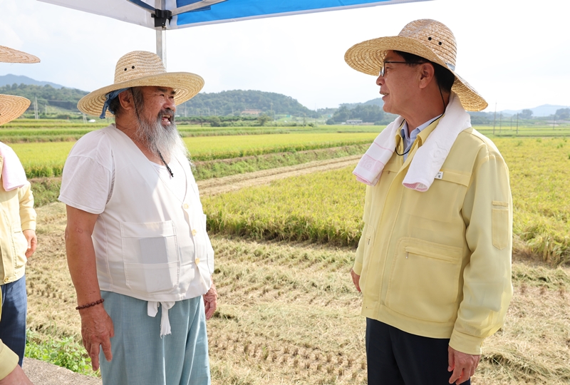 [고창=뉴전북] 심덕섭 고창군수가 4일에 신림면 송용리 ‘2023년산 조생벼 수확 현장’을 찾아 농민의 노고를 위로하고 격려하며 수확의 기쁨을 나눴다.