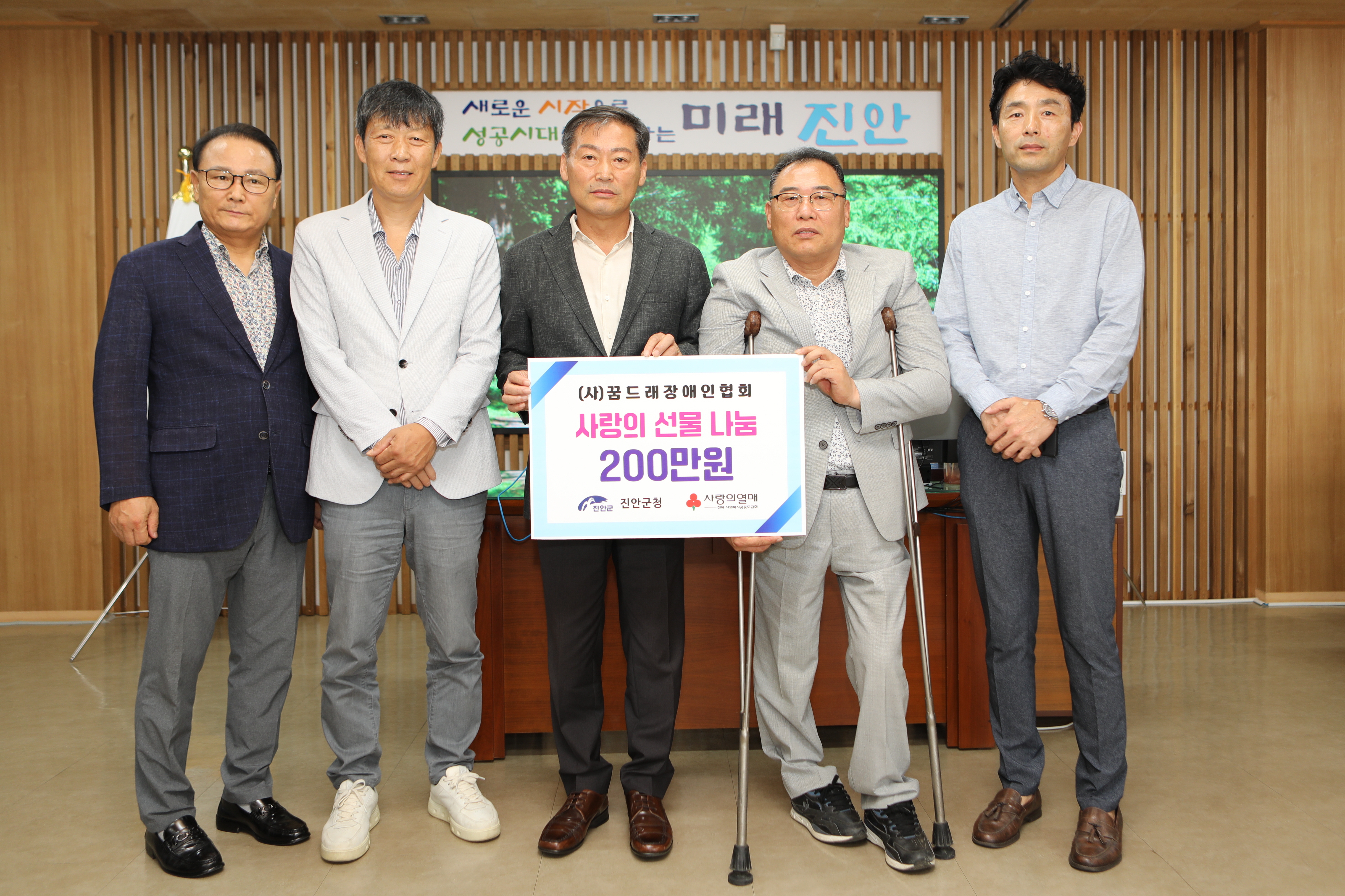 [진안=뉴전북]진안군은 6일 군수실에서 전춘성 진안군수와 (사)꿈드래장애인협회 회장 하태복 회장 등이 참석한 가운데‘이웃돕기 성금 전달식’을 가졌다고 밝혔다.