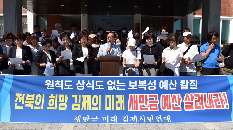 [김제=뉴전북] 새만금 미래 김제시민연대와 김제시 사회단체는 7일 김제시의회 앞에서 새만금 사업 예산삭감에 강력하게 반발하며 정부의 원칙도 상식도 없는 보복성 예산 칼질을 강력히 규탄했다.
