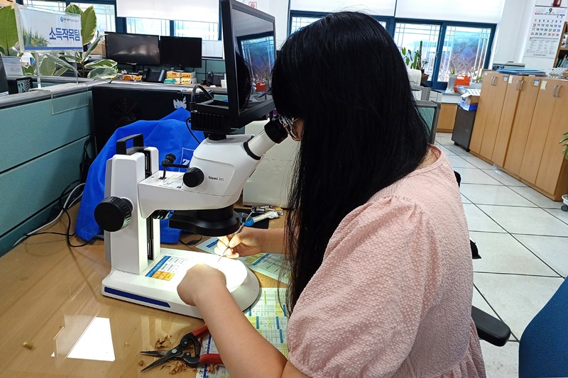 [무주=뉴전북] 무주군이 고품질 겨울딸기 생산을 위해 딸기 ‘꽃눈분화 검경 서비스’를 시행한다고 밝혔다. 꽃눈분화 검경 서비스는 생장점을 현미경으로 관찰해 꽃눈 분화상태를 확인하는 것으로 향후 수확량을 가늠할 수 있다는 점에서 기대를 모으고 있다.