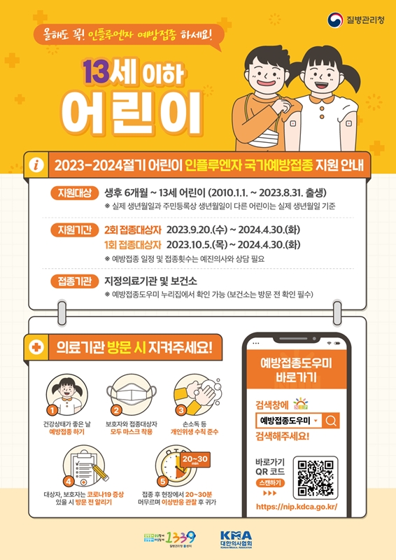 [군산=뉴전북] 군산시가 오는 20일부터 생후 6개월에서 13세 어린이(2010. 1. 1.~ 2023. 8. 31.출생자), 임신부를 대상으로 인플루엔자 무료 예방접종을 실시한다.