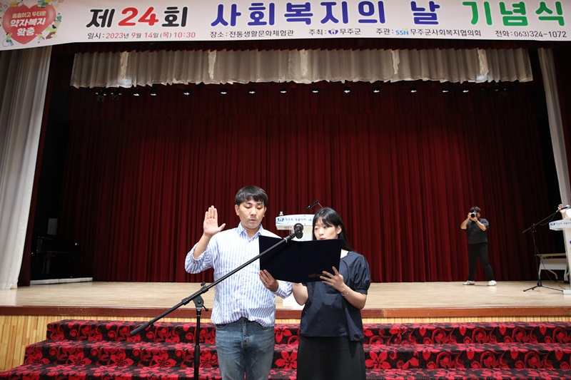 이어 하은의집 오상민 생활재활교사와 무주노인종합복지관 김민지 사회복지사가 무주군 사회복지사업 종사자들을 대표해 사회복지 대상의 인권옹호, 전문적인 복지 서비스 제공, 종사자 간의 상호협력 등의 내용을 담은 사회복지사업 윤리선언을 낭독해 관심을 모았다.