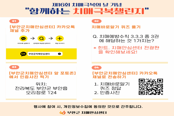 이번 행사는 부안군 치매안심센터 카카오톡 채널을 이용한 온라인 방식으로 운영된다.