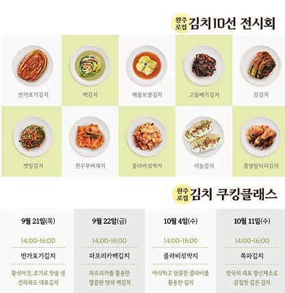 이번 행사는 김치에 들어가는 부재료를 완주의 농산물로 전시하고 맛깔스런 10종 김치를 오감으로 느껴볼 수 있는 시식과 체험이 있는 전시 행사다.