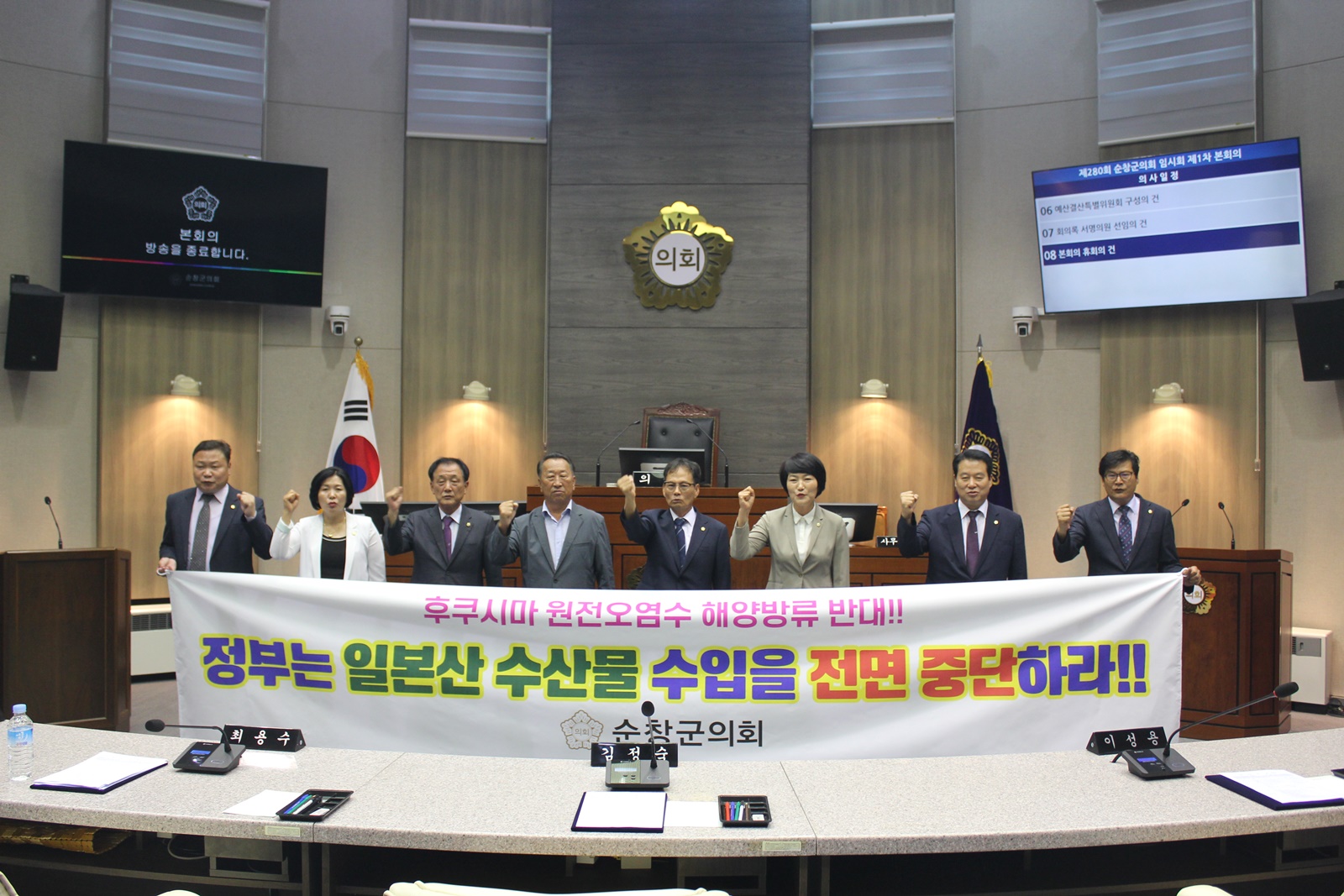 순창군의회는 일본정부의 후쿠시마 원전 오염수 해양 방류를 즉각 중단할 것과 대한민국 정부가 일본 정부를 국제해양법재판소에 제소해야 하며, 후쿠시마 인근 8개 현에만 금지하고 있는 수산물 수입을 전역으로 확대하라는 내용이 담긴 결의문을 국회의장과 행정안전부장관 및 외교부장관, 해양수산부장관에게 송부했다.