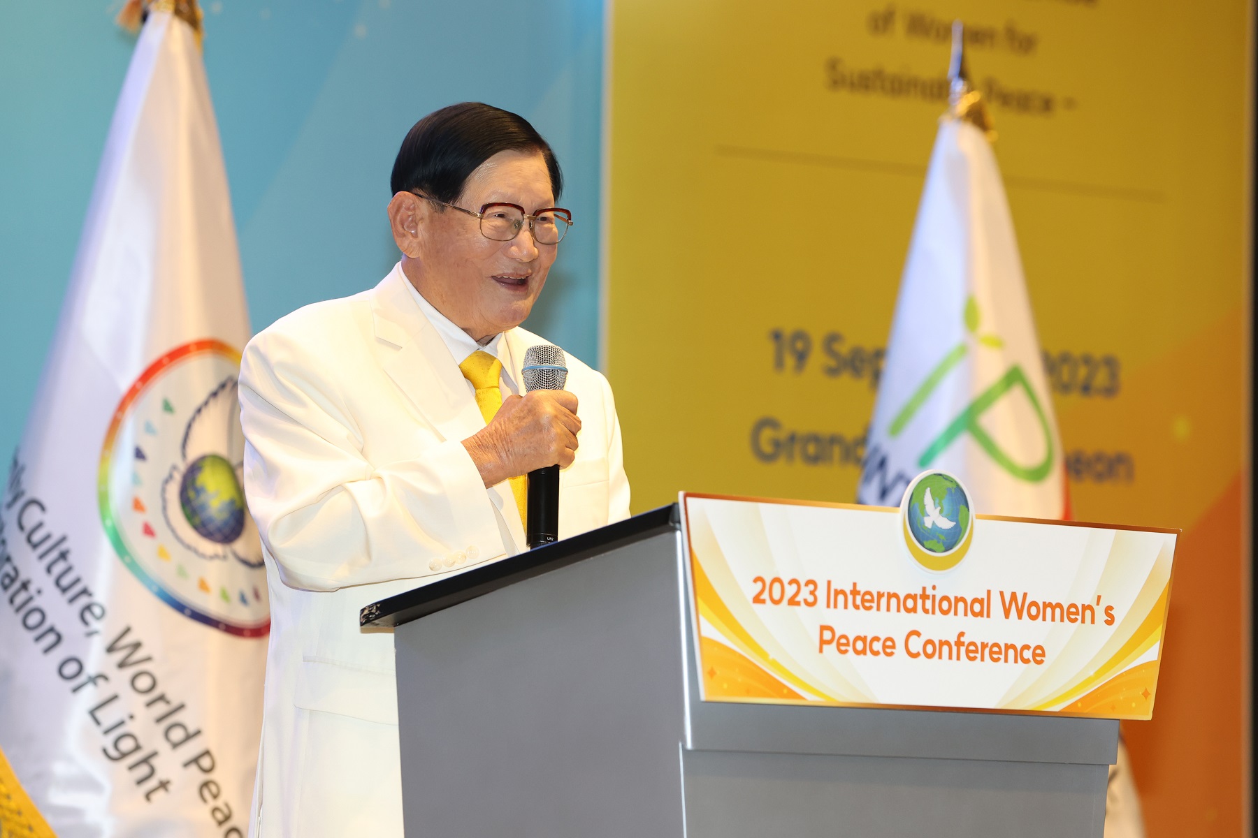 HWPL 9·18 평화 만국회의 제9주년 기념식이 시작된 가운데, 19일 오후 열린 '2023 세계여성평화 콘퍼런스'에서 이만희 대표가 환영사를 발표하고 있다.[사진제공 = HWPL]
