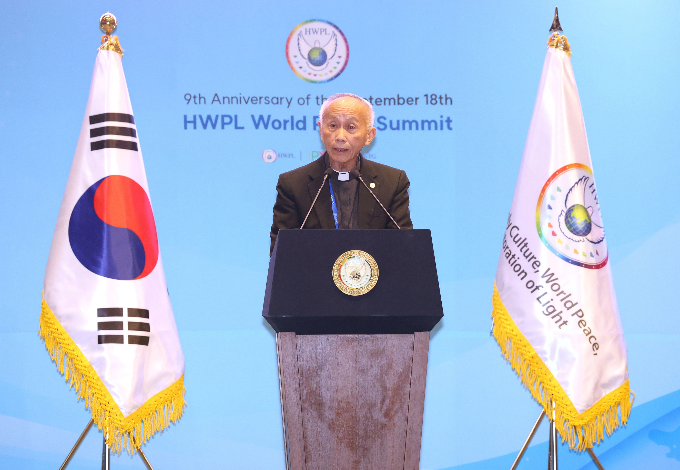 HWPL 9·18 평화 만국회의 제9주년 기념식이 시작된 가운데, 19일 오전 제6회 지구촌 종교지도자 콘퍼런스에서 안토니오 레데스마 전 대주교가 발제하고 있다.[사진제공 = HWPL]