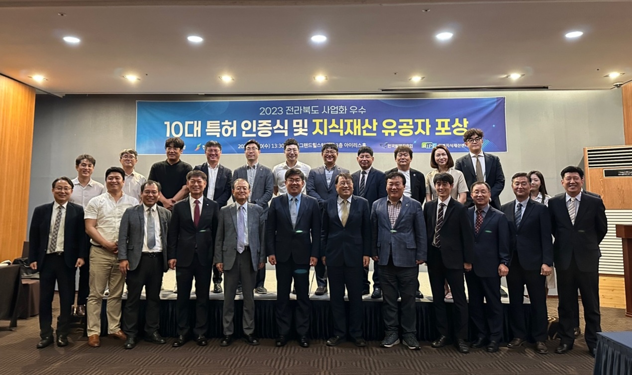 [도정=뉴전북] 전북도는 20일 한국발명진흥회 전북지부 전북지식재산센터와 그랜드힐스턴 호텔에서 2023년 지식재산 기반 사업화 우수 10대 특허 인증식 및 유공자 포상식을 개최했다.