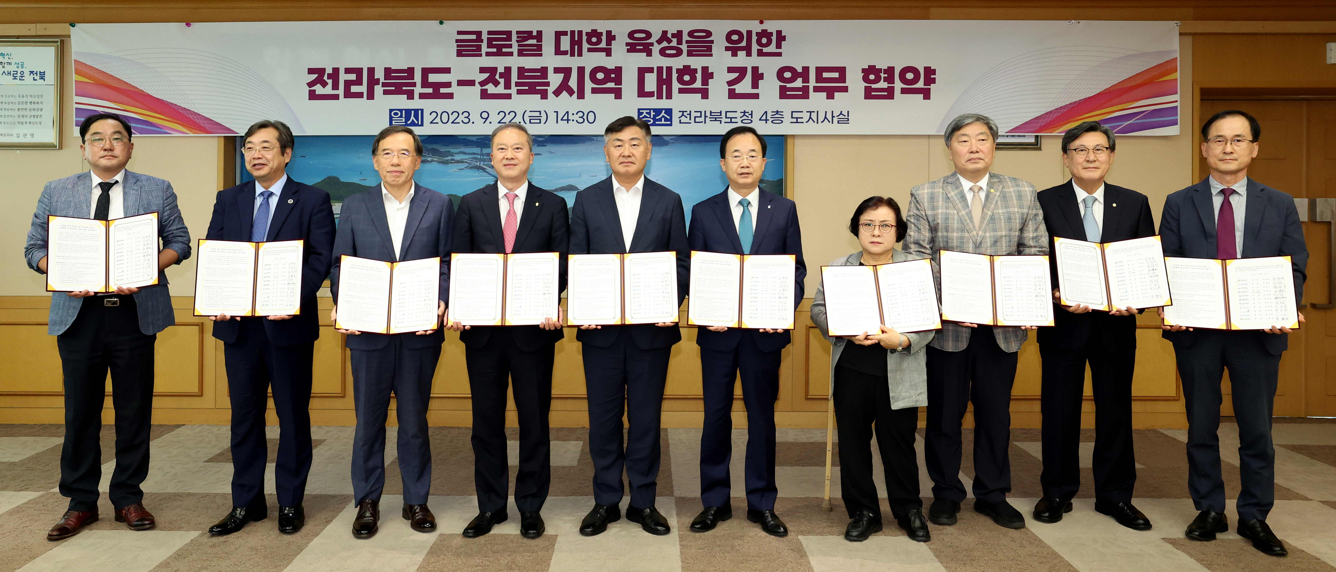 [교육=뉴전북] 전북대학교(총장 양오봉)를 비롯한 전북지역 10개 대학이 922일 전북도청에서 글로컬대학 육성을 위한 전북지역 대학-전라북도 간 업무협약식을 가졌다.