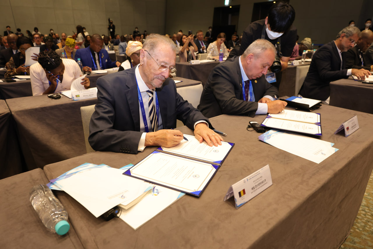 HWPL 9·18 평화 만국회의 9주년 기념식이 개최된 가운데, 18일 오후 열린 '2023 평화 지도자 콘퍼런스'에서 에밀 콘스탄티네스쿠 루마니아 전 대통령이 세계평화 실현을 위한 다짐서에 서명하고 있다. [사진제공 = HWPL ]