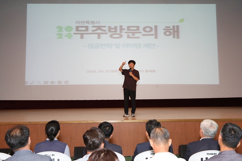 문화기획자 류재현 강사를 초청해 진행한 이날 교육은 무주가 가진 자연환경 자원의 특별함을 부각시킬 수 있는 전략과 방안을 공유하고 공무원들의 각오를 다진다는 취지에서 마련된 것으로 “2024년 무주 방문의 해 성공전략 및 아이템 제안”이라는 주제로 1시간 동안 진행돼 관심을 모았다.