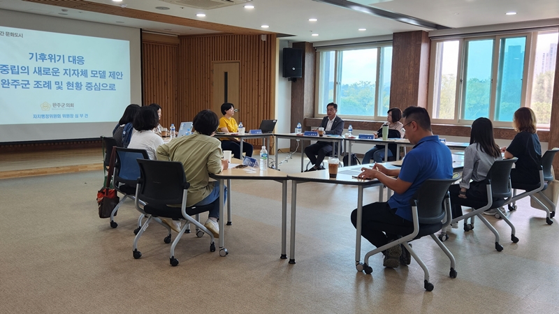 심의원은 기후위기의 현주소와 탄소중립 선언 및 관련 법제화, 완주군 법제화 현황, 완주군 재난 현황, 완주군 집행부 현실 인식, 의회 역할, 시민사회의 현재 및 역할의 순서로 토론을 이어 갔다.