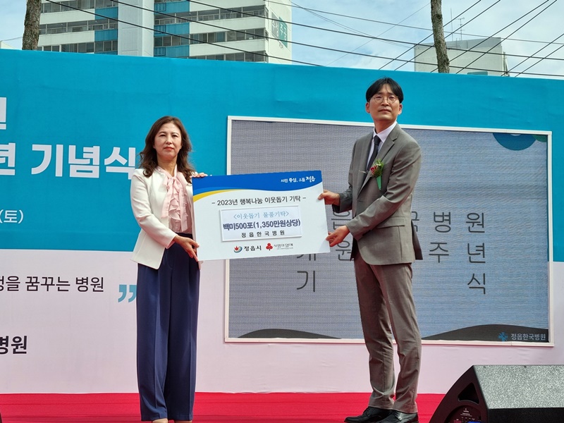 [정읍=뉴전북] 정읍한국병원(대표 오명근)은 지난 23일 개원 1주년을 맞아 정읍시에 1350만원 상당의 백미(10kg) 500포를 기탁했다. 이날 한국병원에서 진행된 기탁식에는 서미현 사회복지과장과 오명근 대표가 참석했다.