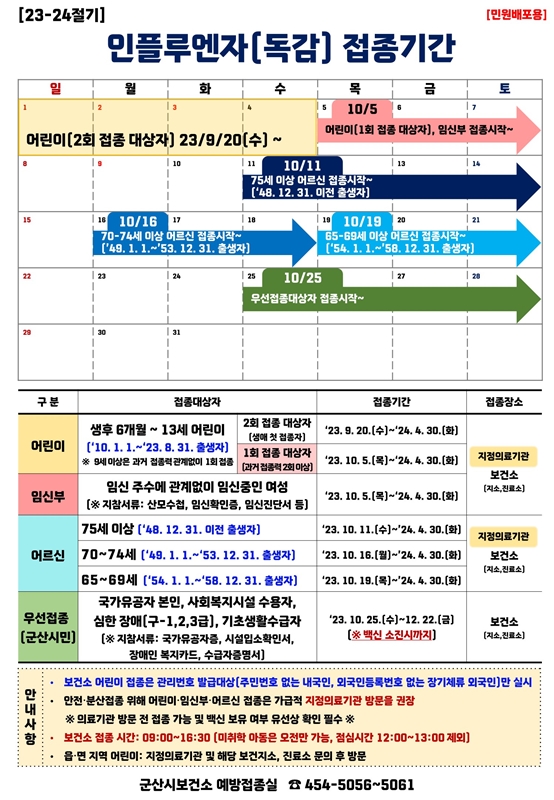 75세 이상은 10월 11일부터, 70~74세는 10월 16일부터, 65~69세는 10월 19일부터 주소지 관계없이 전국 지정 위탁의료기관에서 무료로 접종할 수 있다.