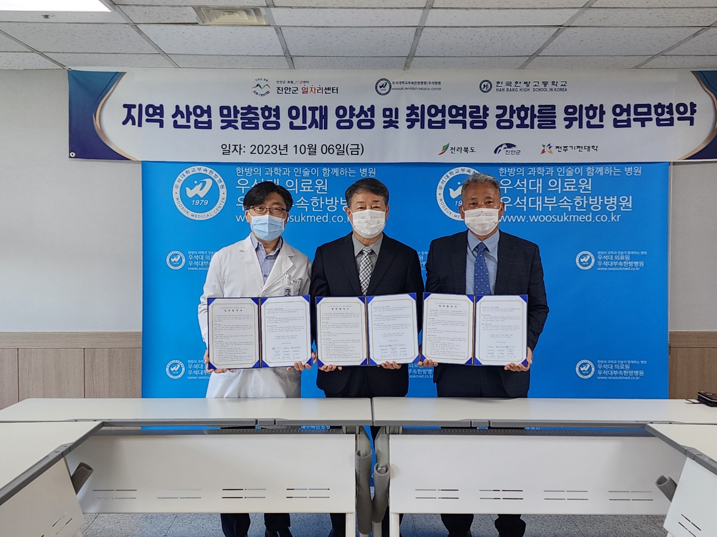 [진안=뉴전북]진안군일자리센터는 6일 우석대학교부속한방병원에서 우석대학교부속한방병원과 한국한방고등학교와 함께 지역 인재 양성 및 취업역량 강화를 위한 현장견학·실습 지원을 통한 진로·취업활성화를 위한 업무협약을 체결했다.