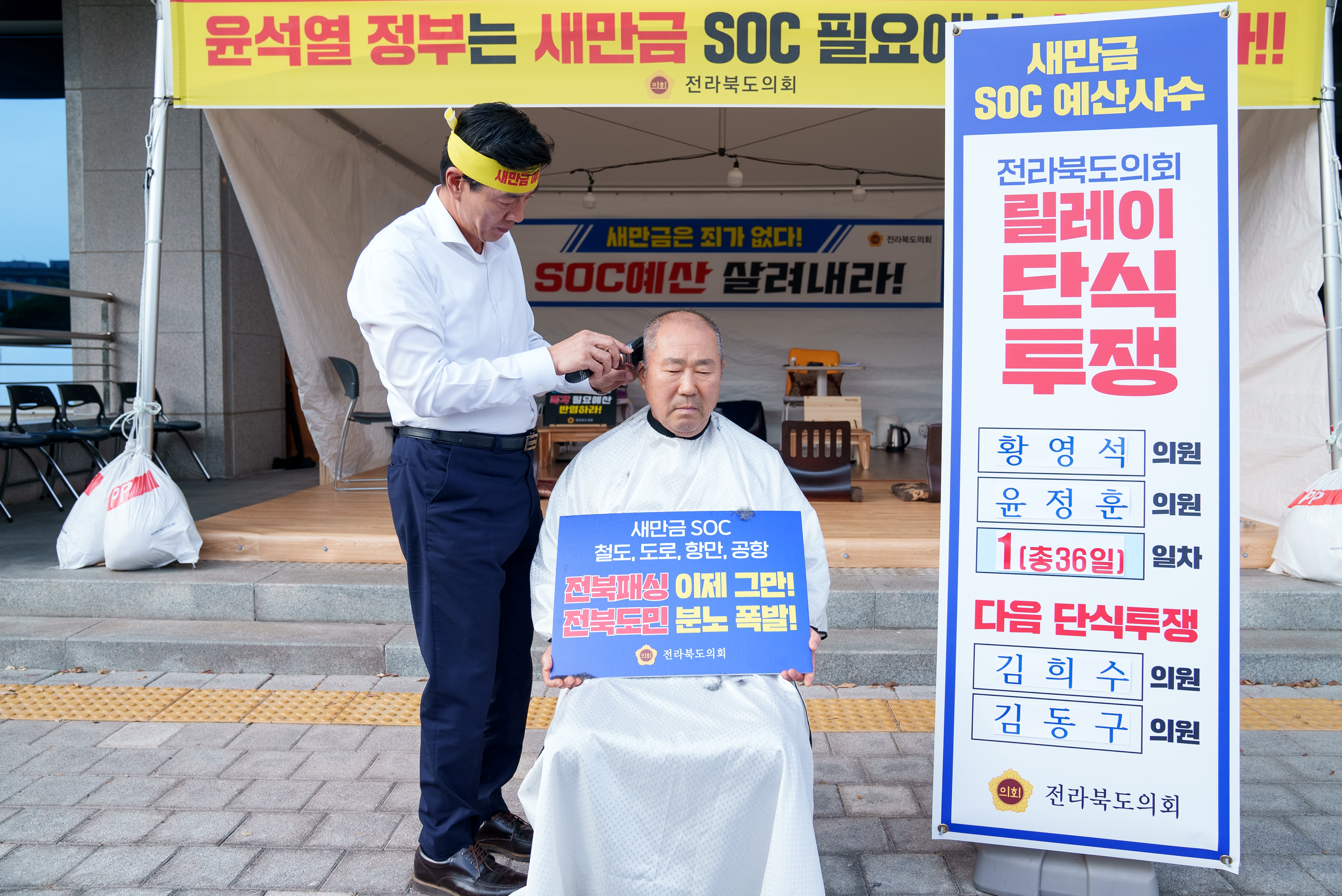 [전주=뉴전북] 전북도의회 황영석(김제2) 의원은 10일 오후 도의회 천막농성장에서 새만금 SOC 예산 삭감에 대한 중앙정부의 신속한 예산복원을 촉구하는 2차 삭발을 단행했다.